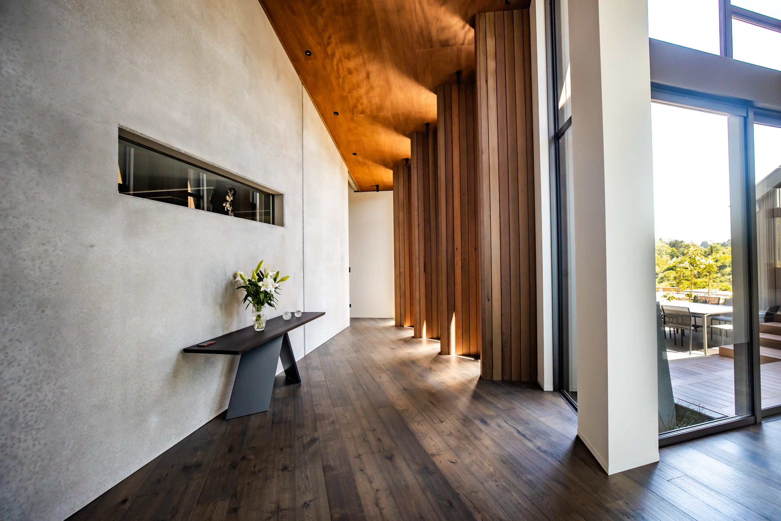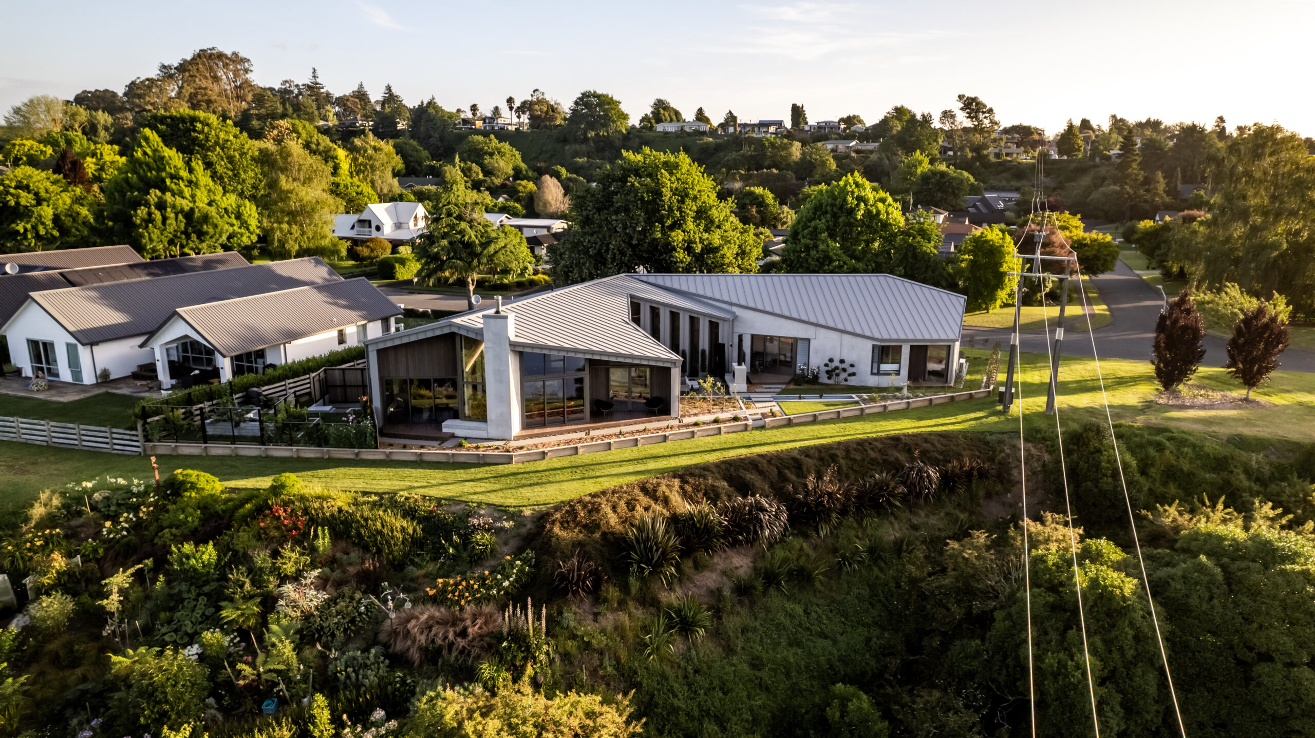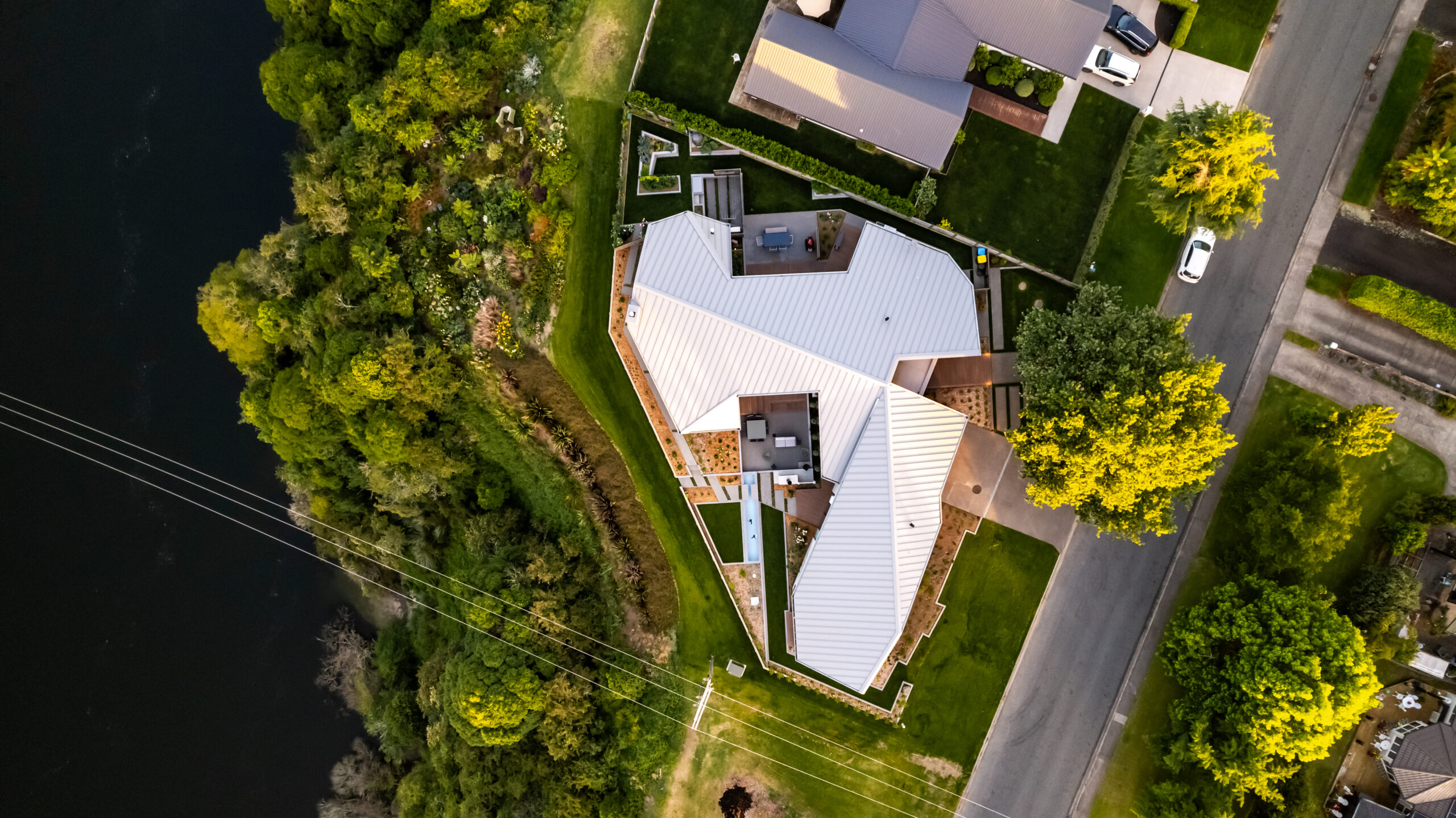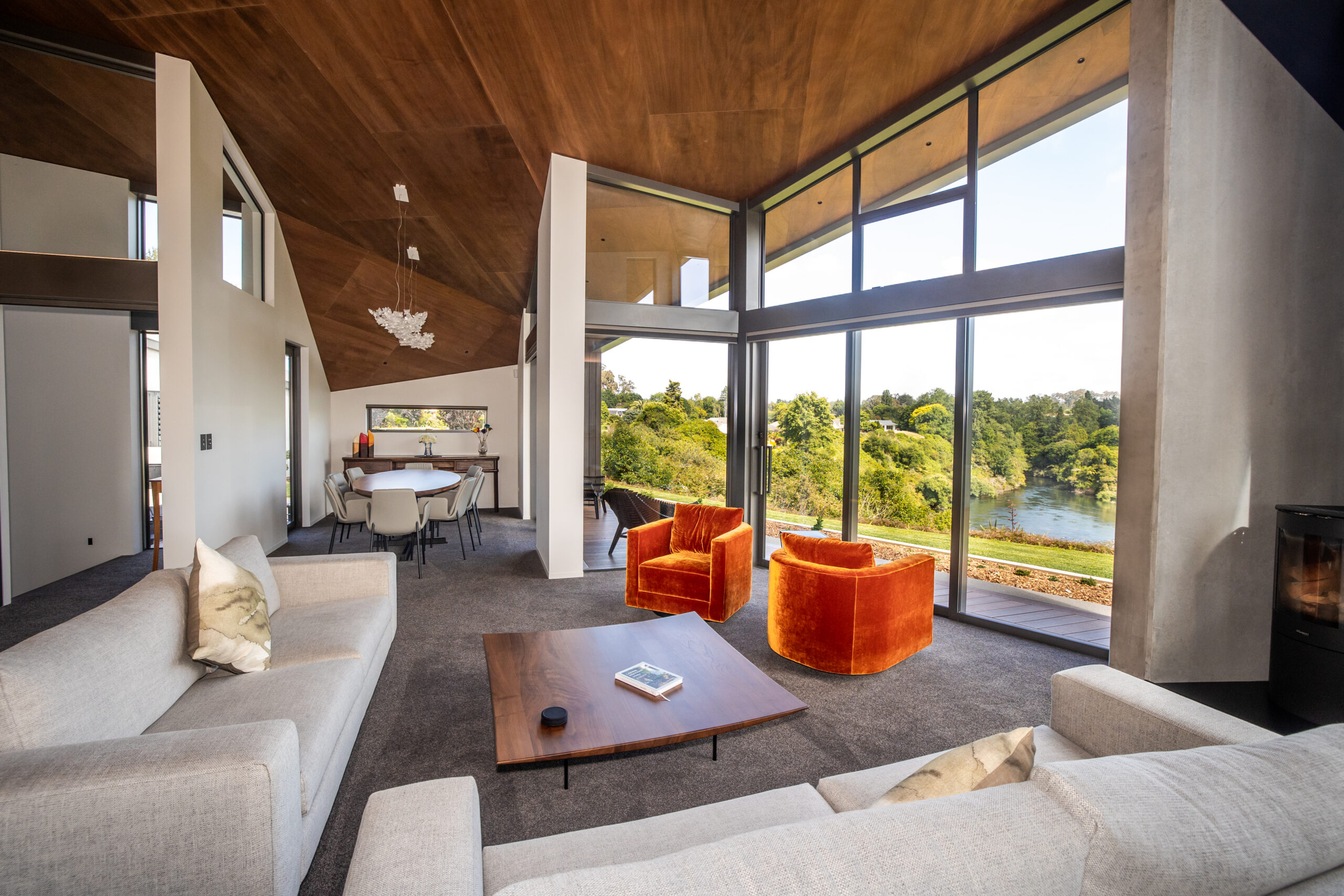 Nestled on the picturesque banks of the Waikato River, this stunning home offers captivating vistas of the river’s swirling currents and the lush greenery of the golf course on the opposite bank. Its striking exterior features a harmonious blend of metal cladding, concrete, and timber weatherboard, while inside, the dark timber floors beautifully contrast the warm richness of the ply ceiling and concrete walls. With dynamic ceiling lines that expand the sense of space, every room opens up to reveal the breathtaking, expansive views.