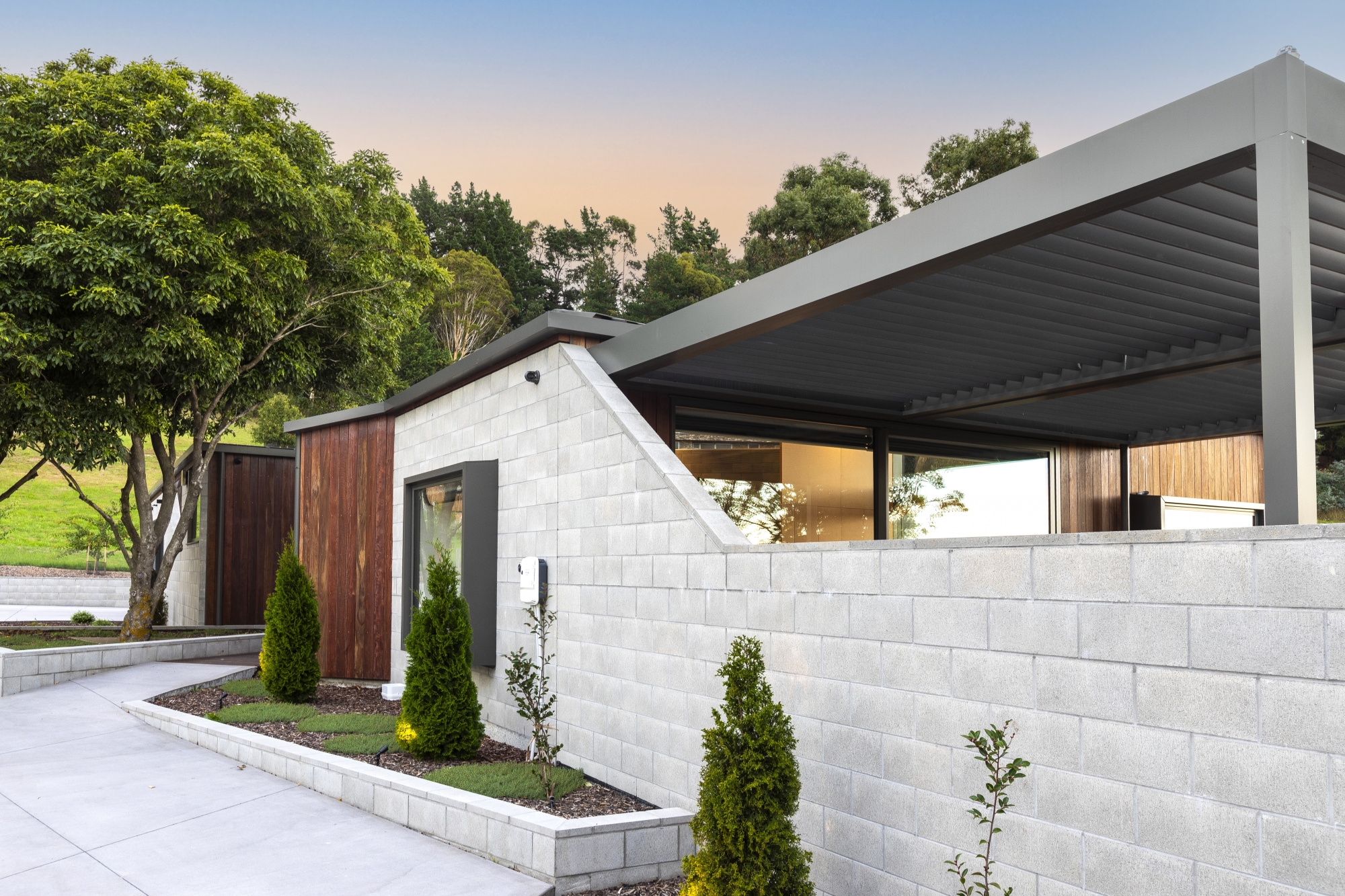 Material choices emphasise warmth, durability, and harmony with the surrounding environment. Textured surfaces and natural finishes create visual interest and a sense of continuity between indoor and outdoor spaces.