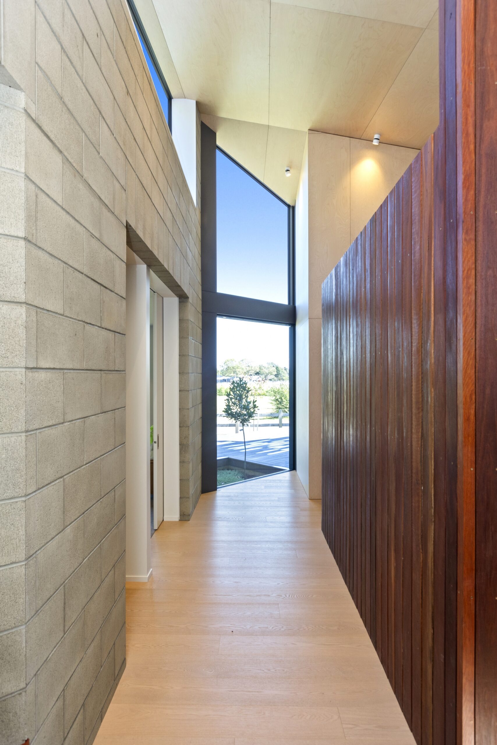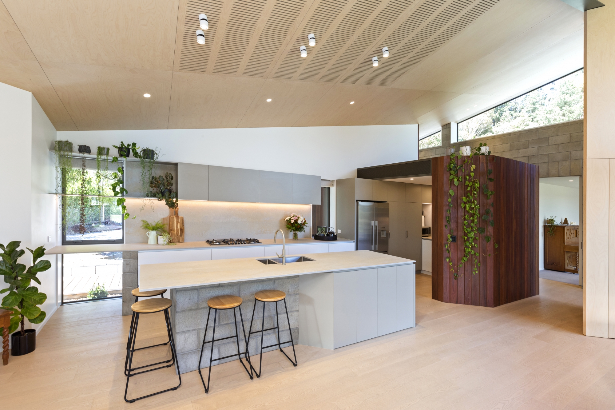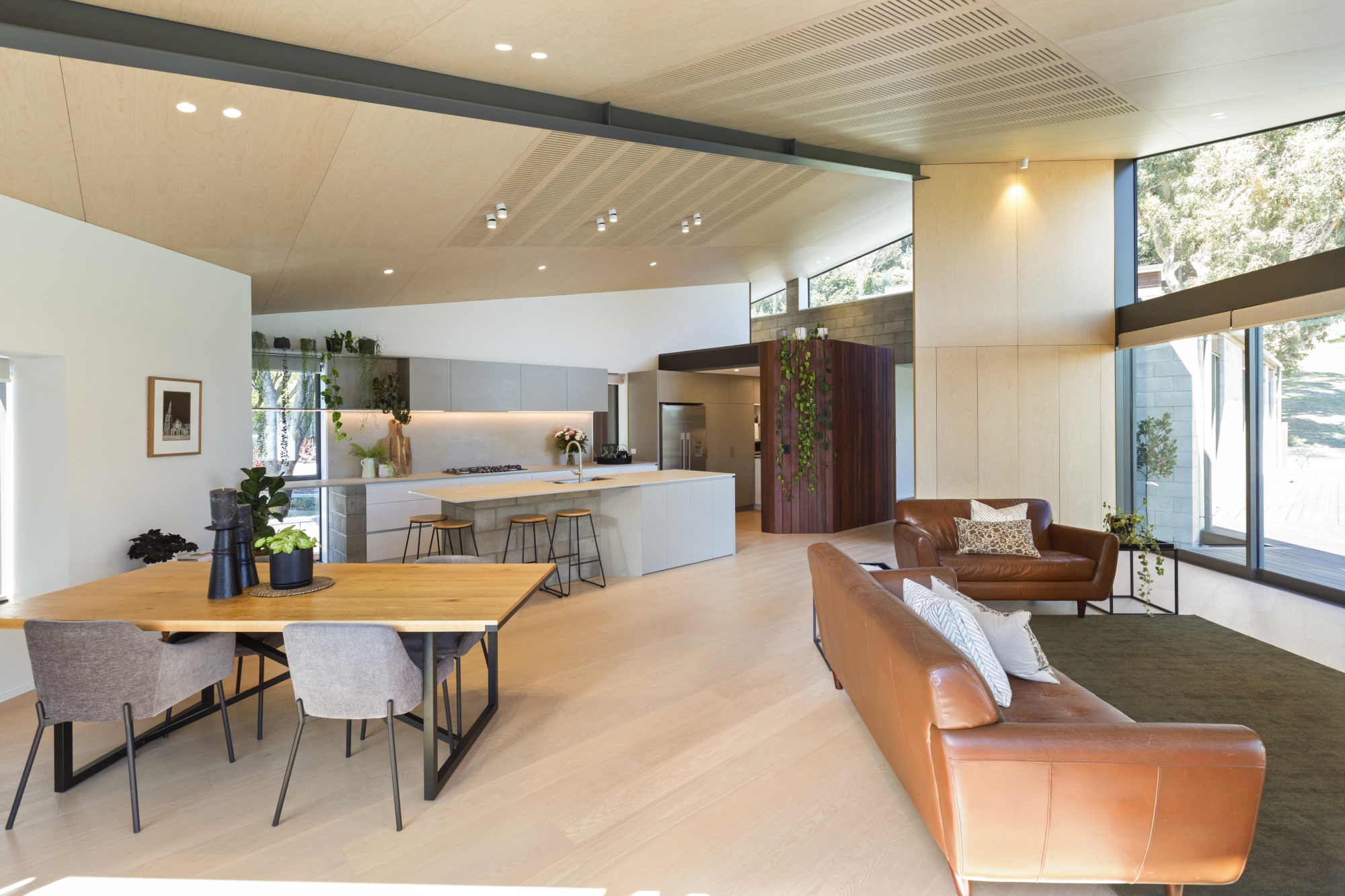 High ceilings and generous volumes in the living spaces create an airy, open feel that engages occupants with the outdoors. Carefully placed openings frame the landscape, while sheltered outdoor areas ensure the home works comfortably across seasons.